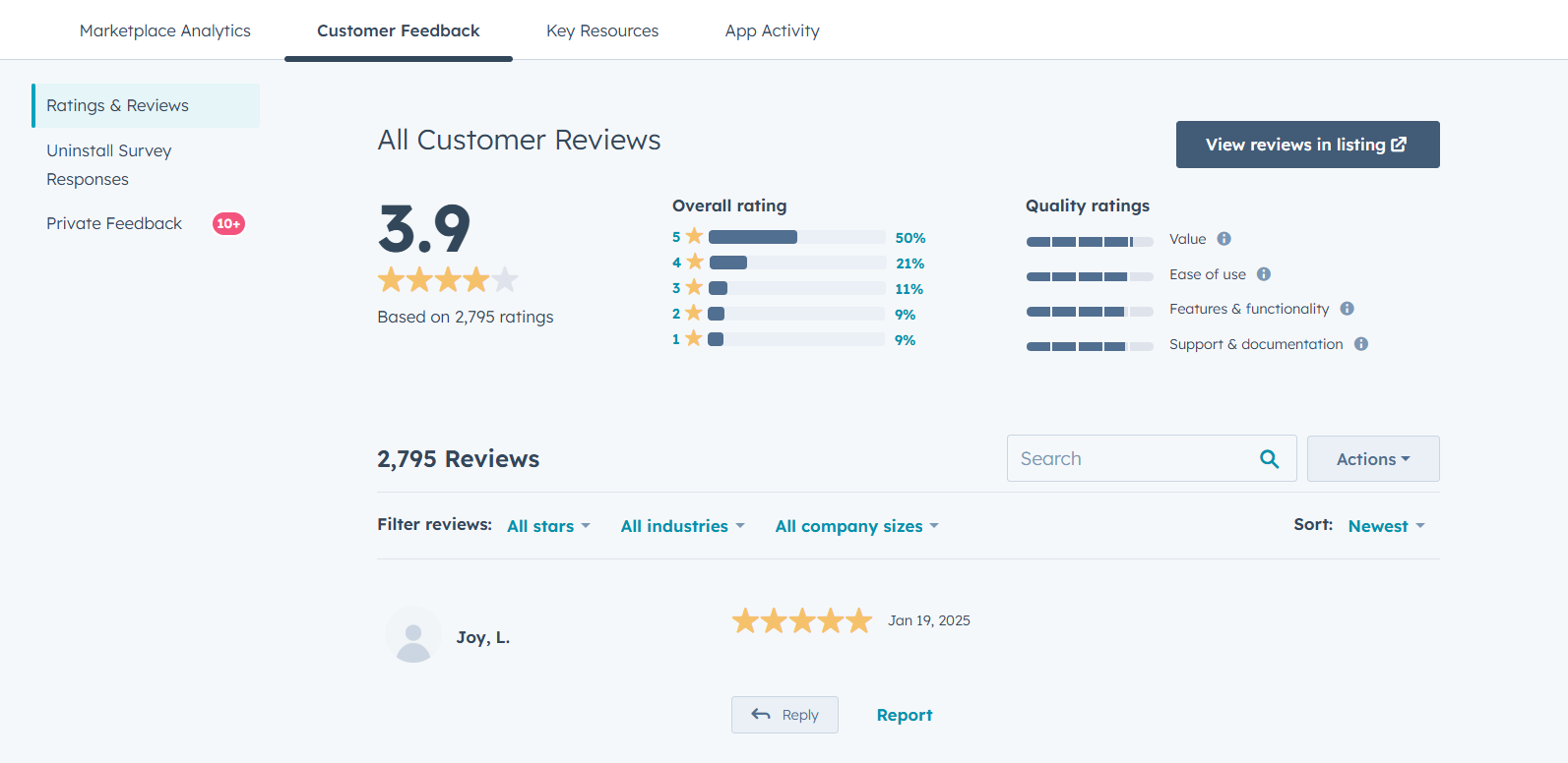 Im Abschnitt Bewertungen & Rezensionen können Sie die Rezensionen nach der Anzahl der vergebenen Sterne, der Branche des Kunden und der Unternehmensgröße des Kunden filtern.