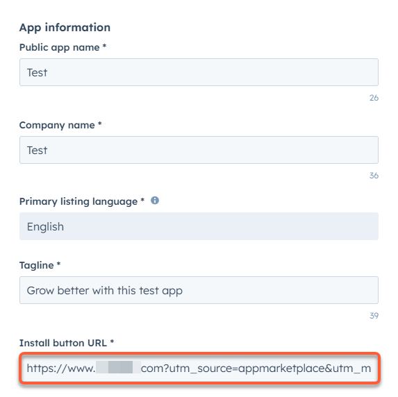Aktualisieren Sie auf der Registerkarte Listing-Informationen die URL im Feld URL der Installationsschaltfläche mit Ihren UTM-Parametern.