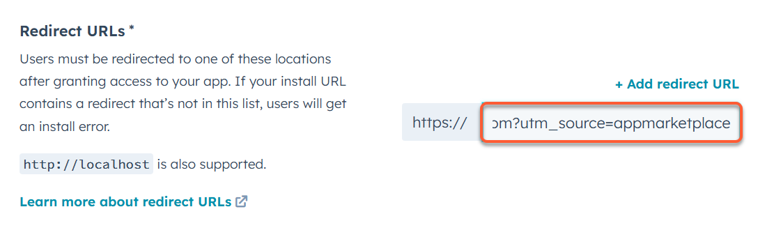 - Aktualisieren Sie im Abschnitt Weiterleitungs-URLs Ihre Weiterleitungs-URL, damit sie Ihre UTM-Parameter enthält. Dadurch wird die Installations-URL der App nach dem Speichern aktualisiert. Sie müssen also sicherstellen, dass Sie alle benutzerorientierten Links aktualisiert haben, um die neue URL zu verwenden.