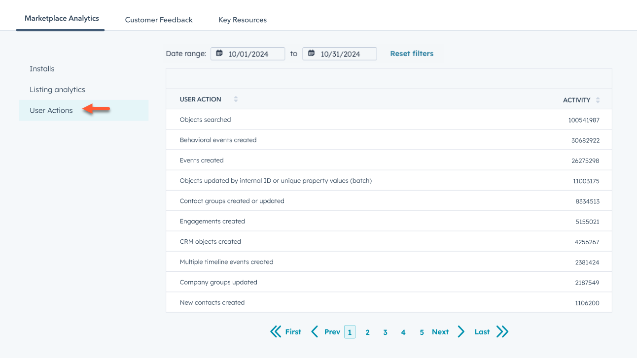 Nach dem Listing Ihrer App im HubSpot App Marketplace können Sie die Performance-Kennzahlen Ihrer App in Ihrem Entwickler-Account überprüfen. Dazu gehören Leistungsangaben wie Nutzungsdaten, Installationsdaten und Listing-Analytics.