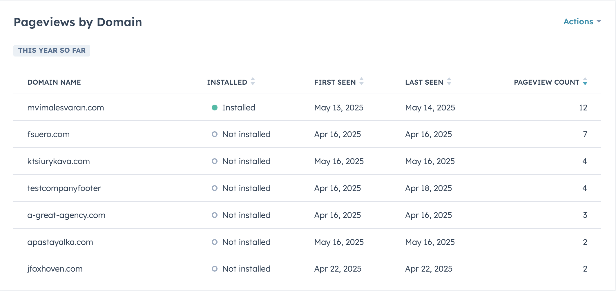 - Erste Aktivität: Dies ist das Datum des ersten Seitenaufrufs, der dieser Domain zugeordnet ist.